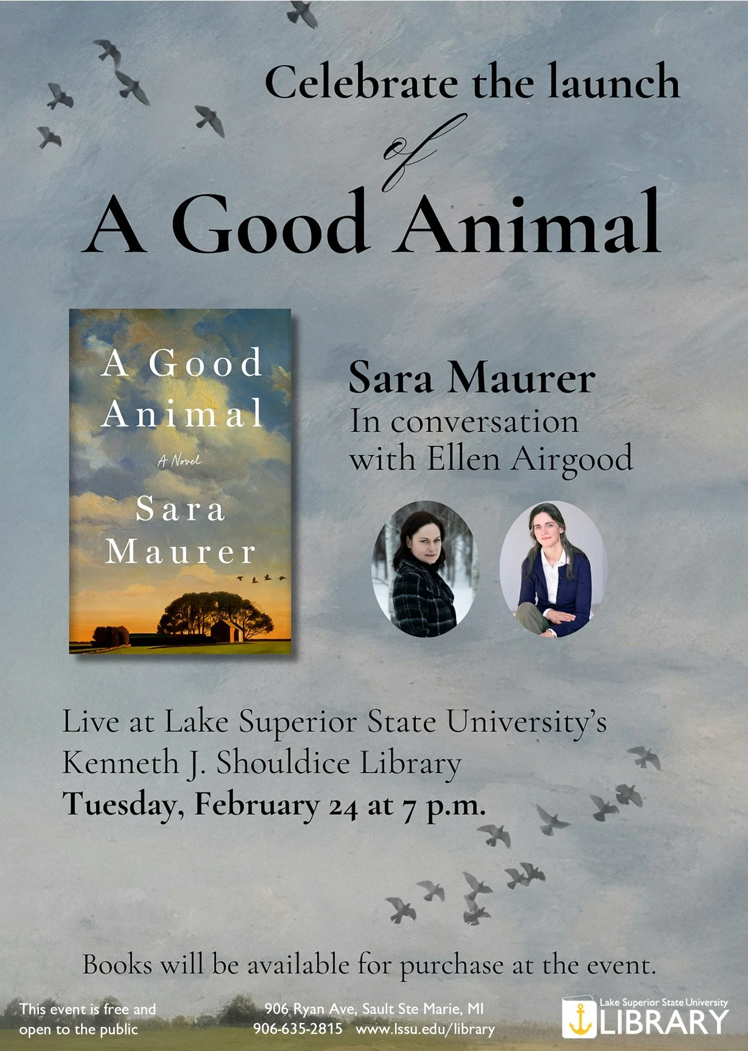 Join debut author Sara Maurer in conversation with novelist Ellen Airgood at the Kenneth J. Shouldice Library at Lake Superior State University as they celebrate the launch of Sara’s coming-of-age novel, A Good Animal.