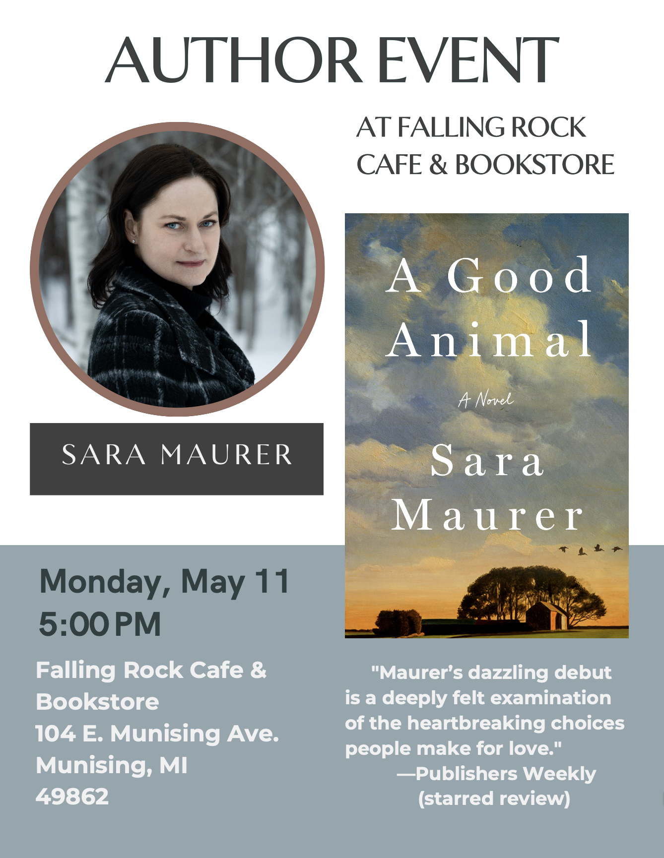 Falling Rock Cafe & Bookstore in Munising, MI, will host Sara Maurer to celebrate the release of her debut novel, A Good Animal.