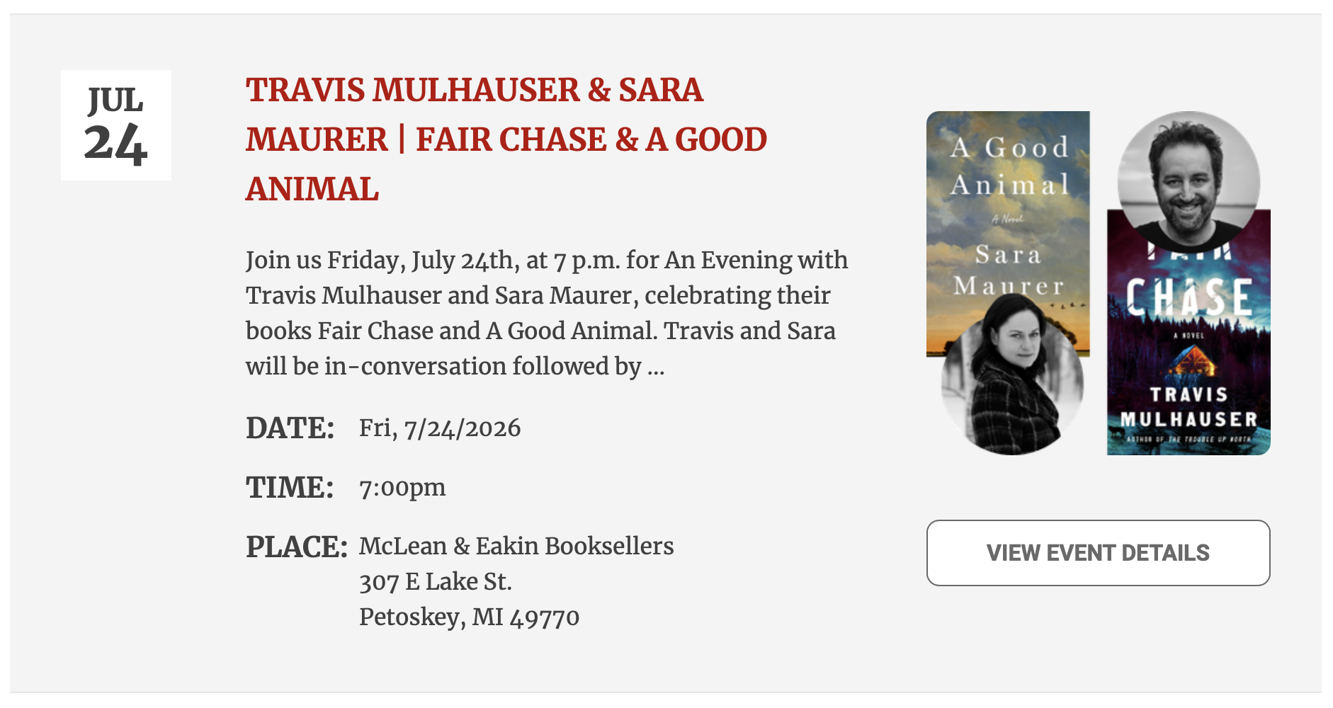 Join us Friday, July 24th, at 7 p.m. for An Evening with Travis Mulhauser and Sara Maurer, celebrating their books Fair Chase and A Good Animal. Travis and Sara will be in-conversation followed by a time for questions and book signing.